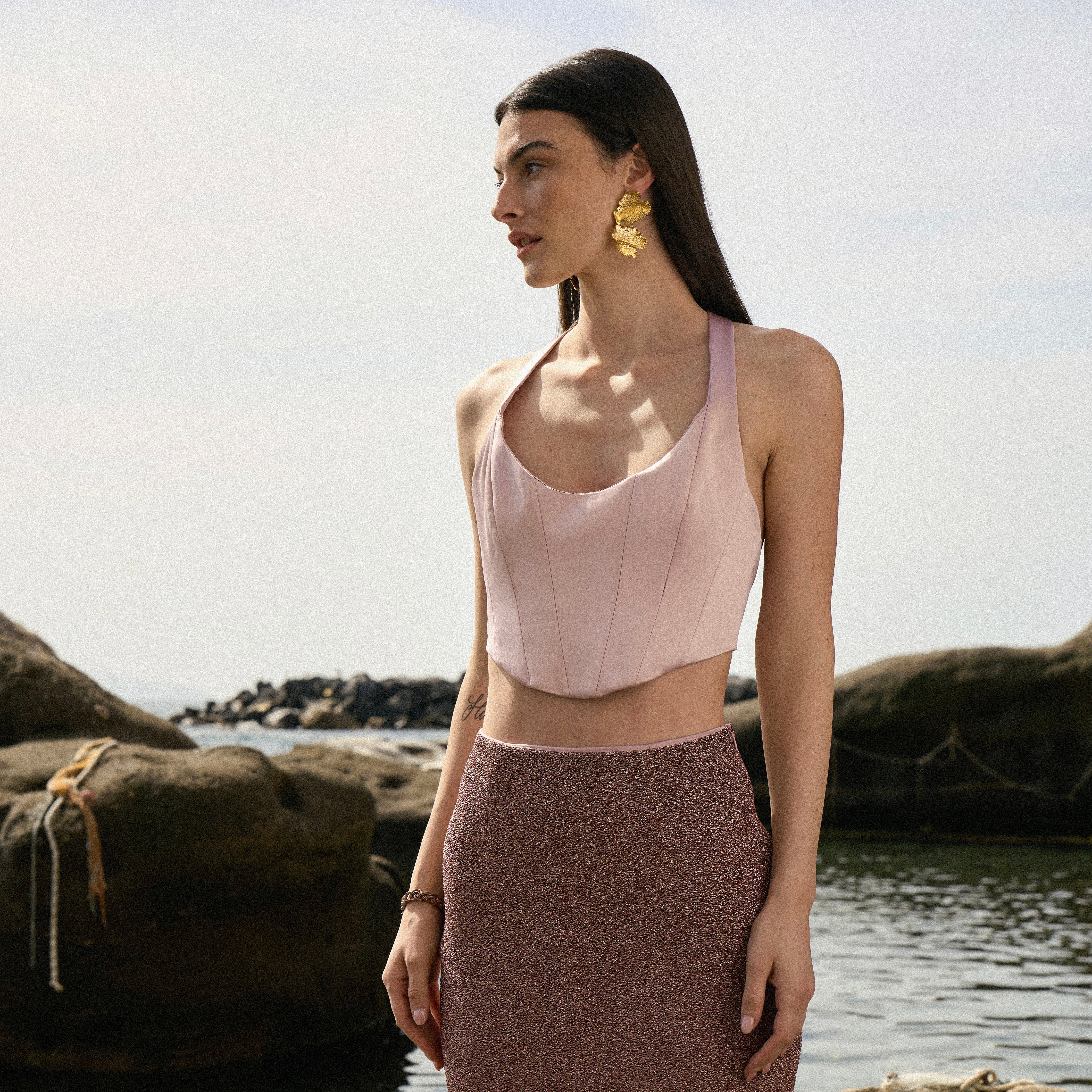 Corsetto a punta steccato con chiusura nel centro dietro con cerniera invisibile.