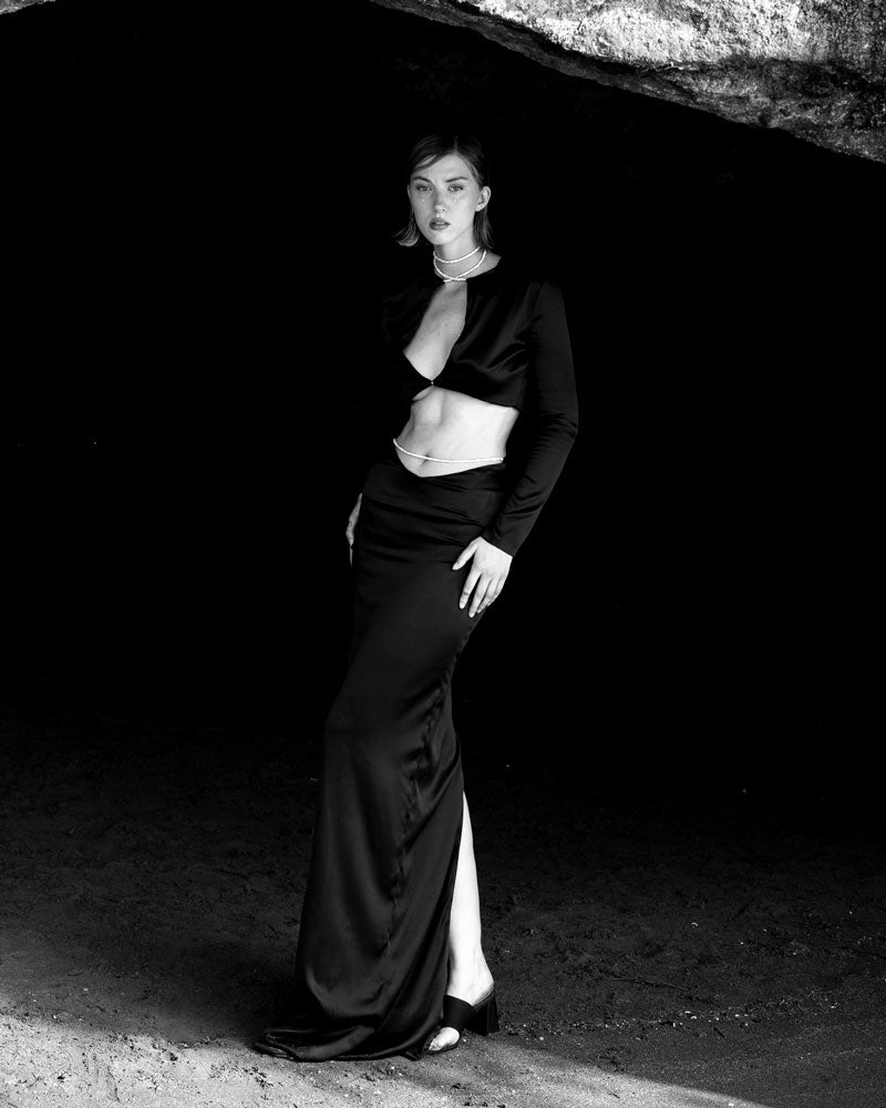 Gonna realizzata in pura seta con una lunga silhouette pencil.