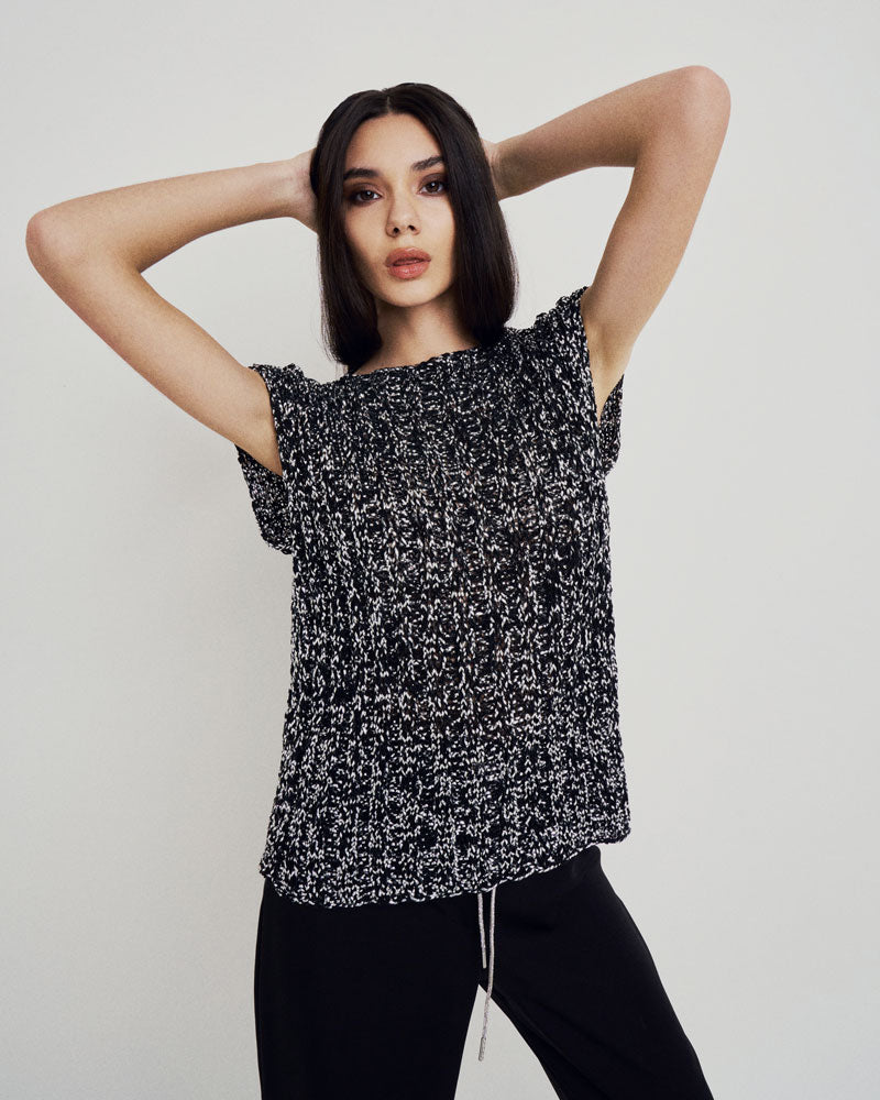 Maglia a giromaniche con scollo a barca realizzata interamente a mano con fili di pelle bovina.