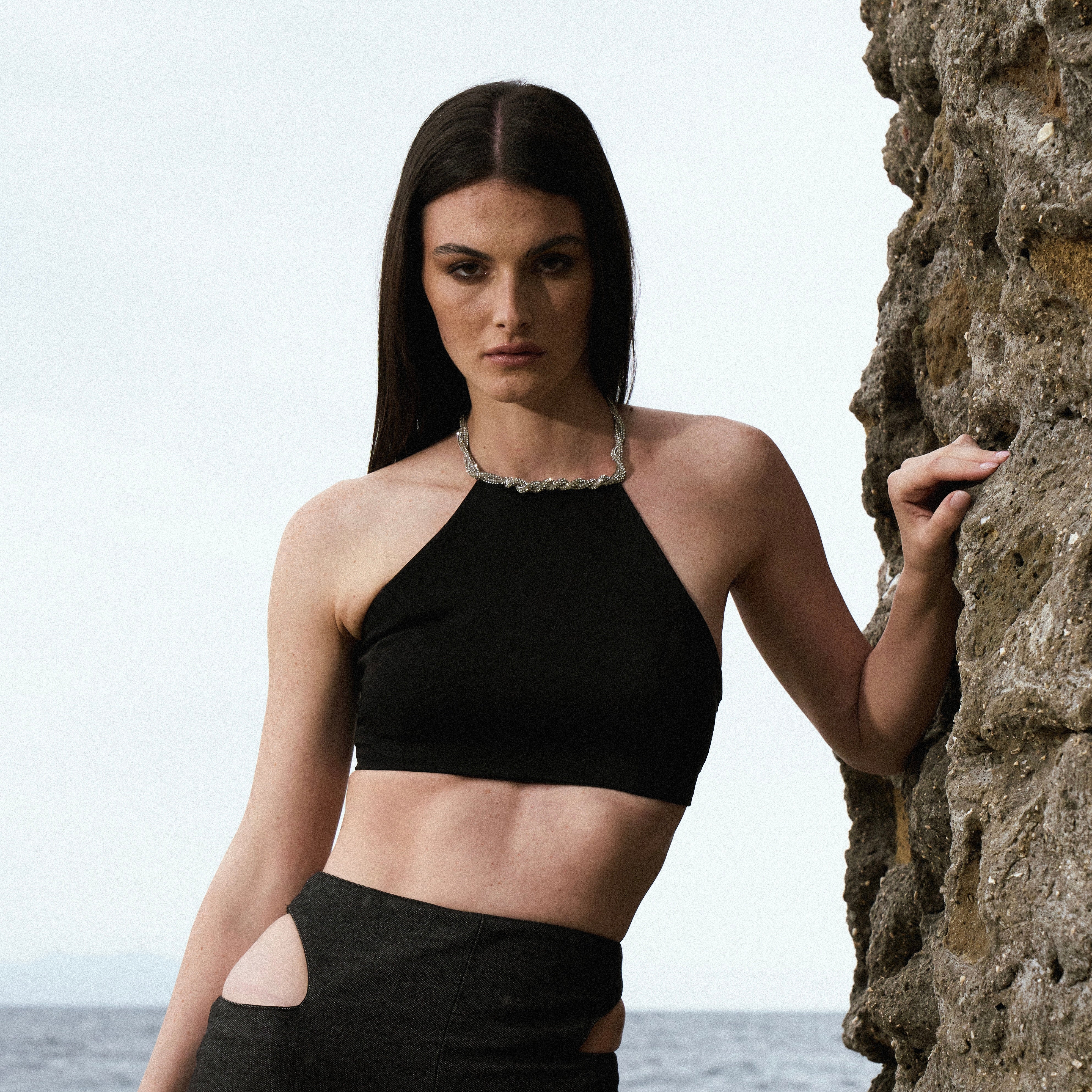 Crop top con scollo all’americana e laccio strass intrecciato. Cerniera posteriore invisibile.